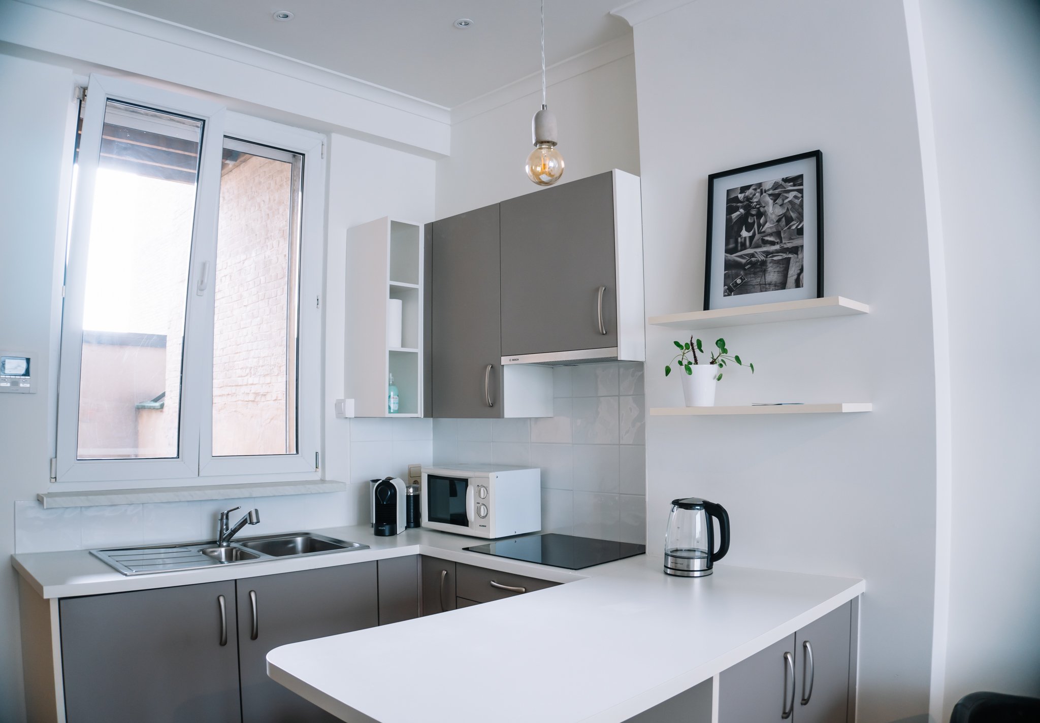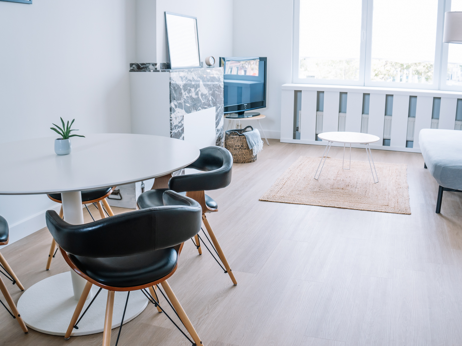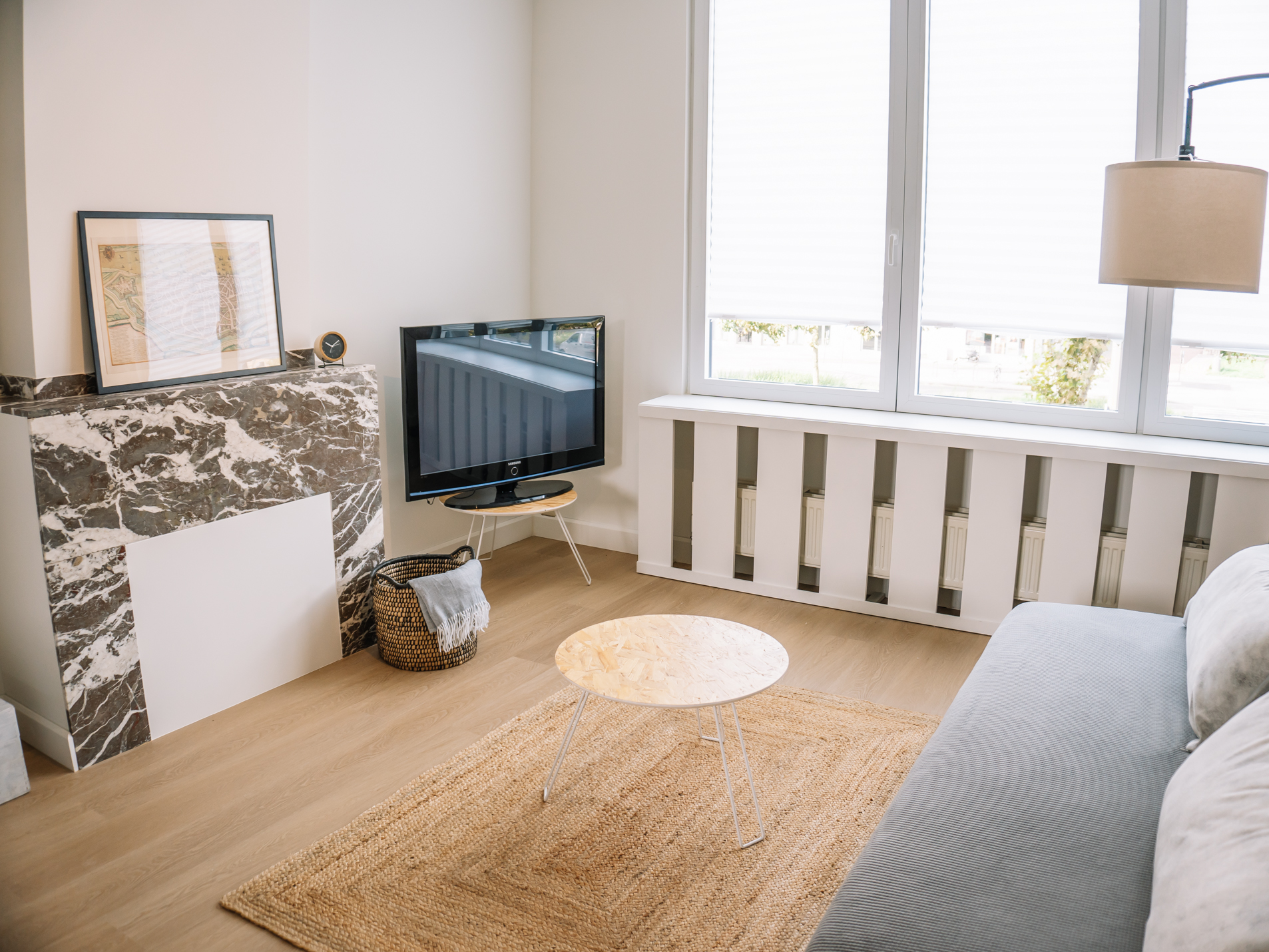 The flat has large windows that bring a lot of light into the room. There is a cosy sitting area with TV and the old fireplace is finished in marble. In the open kitchen you will find all appliances and the open dining area.
